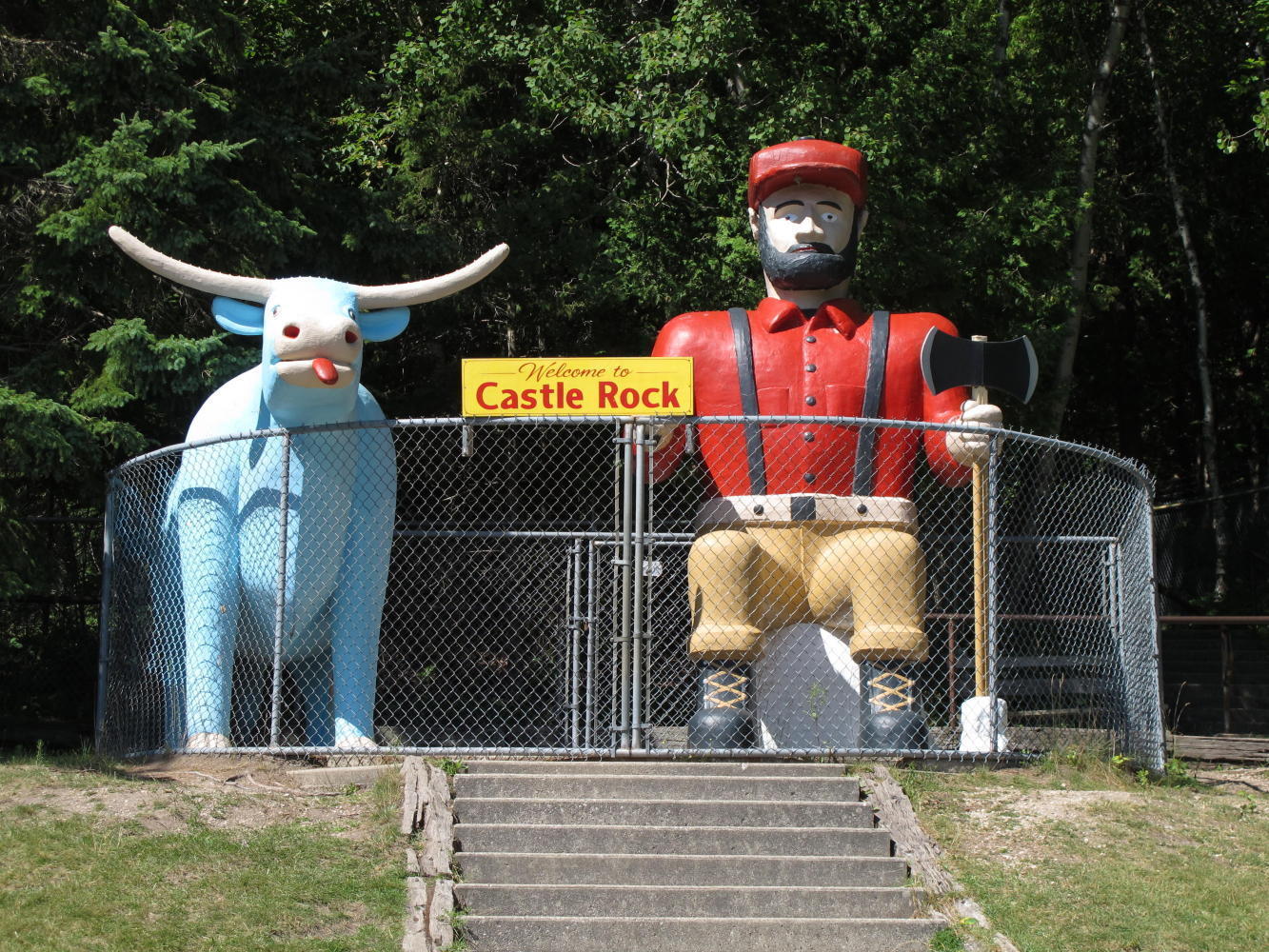 Holy cow! Today, Kim and I returned to civilization with a BANG! First of all, upon departing our campsite, we played tourist at the nearby Castle Rock, which affords a view of the local countryside from 200 feet above the trees. (It also has glitzy statues of Paul Bunyan and his blue ox, Babe).