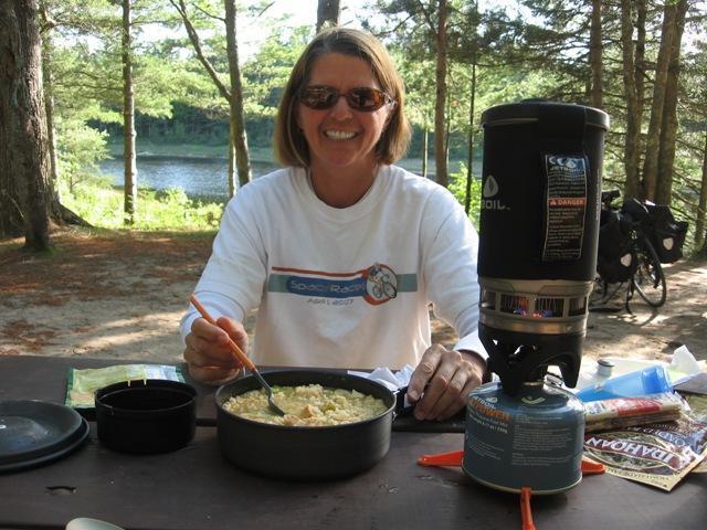 Anyway, we got a camp site right on the lake's edge, so we indulged ourselves by jumping into the lake in our bicycle clothes. Tonight, Kim - the master chef - whipped up a meal of pre-packaged chicken-n-rice on her jet boil for supper. Since we had no wood, we didn't build a fire . . . so we just looked at the stars.