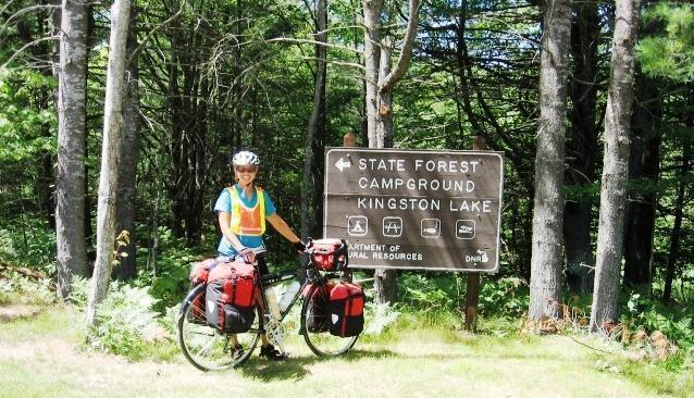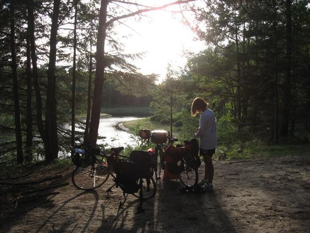 In the late afternoon, we pulled into Kingston Lake, a campground operated by the Michigan Department of Natural Resources with pit toilets, no showers, and water from a hand-pump that left an after-taste in your mouth. Can you believe that Kim is putting up with this crap? But in fact, she actually stated "All I want to do is ride my bike and camp."