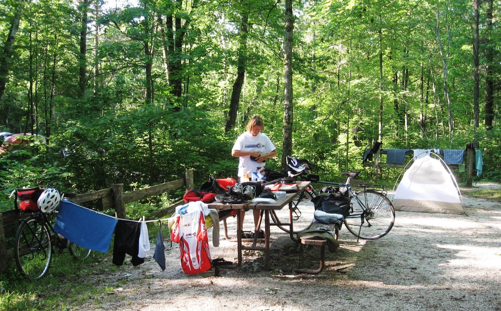 This morning's sunlight revealed that somehow, our panniers had exploded the previous evening, leaving all of our gear strewn across the picnic table.