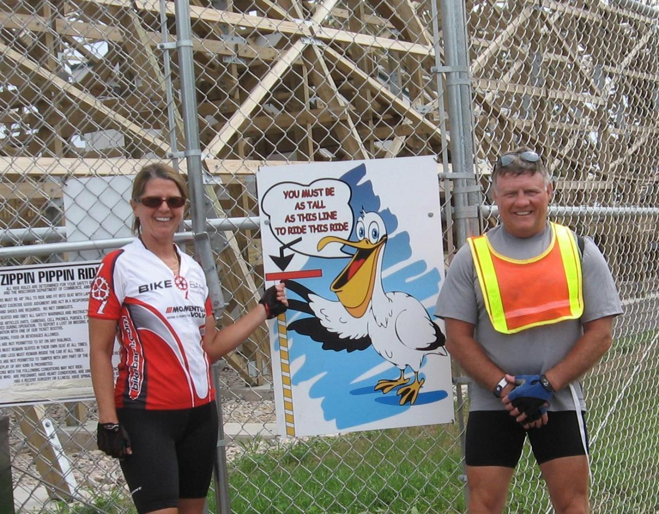 For one last time, Jonah and Nikki fixed Kim and me a big breakfast this morning, then we hit the road around 9:30. We pedaled down the eastern shore of Lake Michigan - with no headwinds and no hills - to Green Bay, Wisconsin. While pedaling through the city, we took lots of pictures of "Americana", and took a break to ride the "Zippin' Pippin'." This is a classic, old, wooden roller coaster that was Elvis Presley's personal favorite.